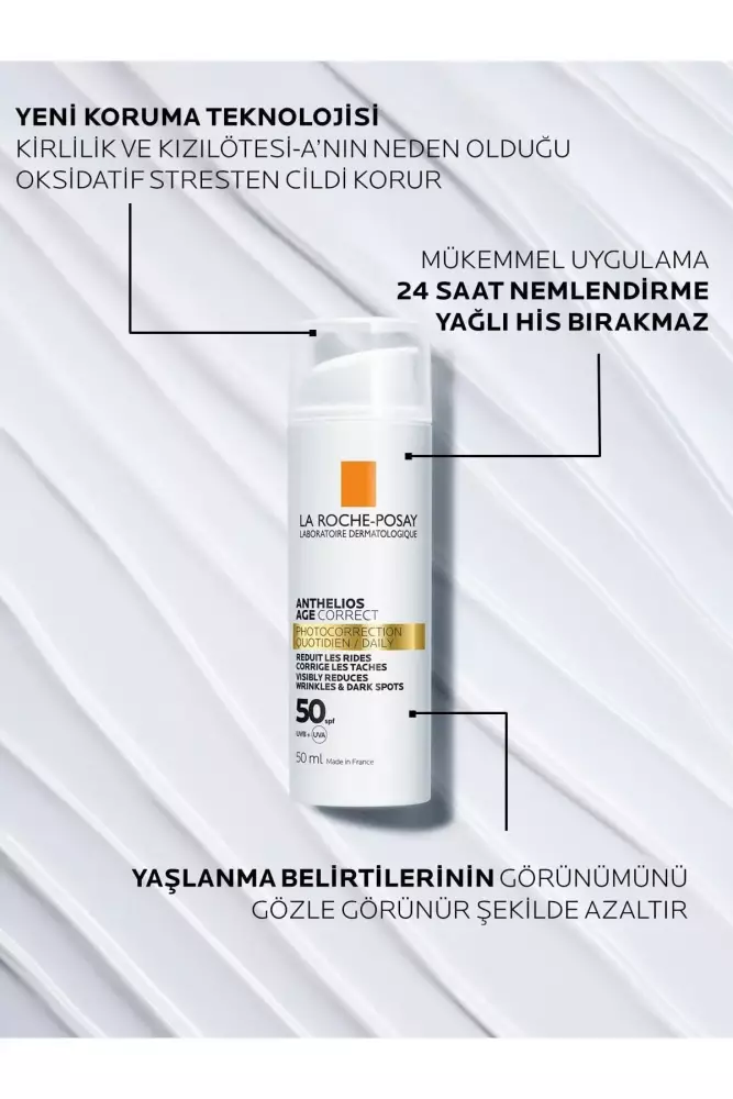 La Roche-Posay Anthelios Age Correct Photocorrection Daily CC Cream SPF 50, cilt bakımını ve güneş korumasını birleştiren yenilikçi bir üründür. Bu renkli CC krem, cildi güneşin zararlı UVA ve UVB ışınlarından korurken (SPF 50), aynı zamanda yaşlanma belirtilerini hedef alır. Hafif renkli formülü, cilt tonunu eşitler ve doğal bir görünüm sağlar. Yağsız yapısıyla ciltte ağır bir his bırakmaz, tüm cilt tipleri için uygundur.