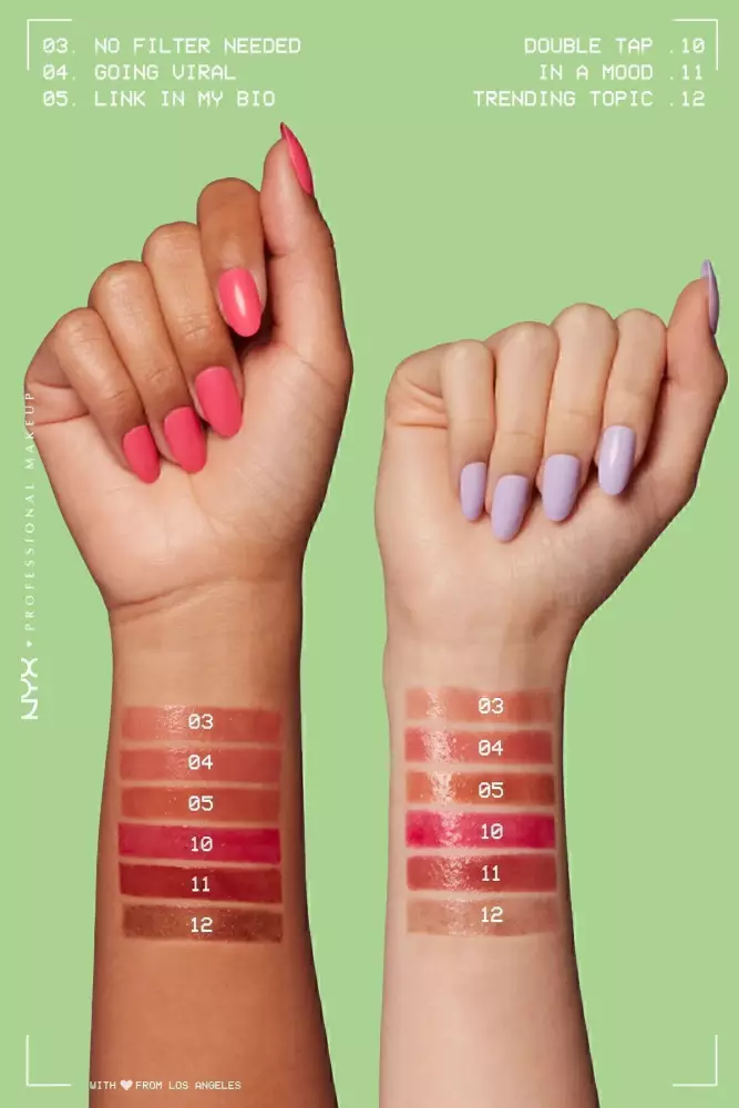 - *Renkler:* "Main Character" (şeffaf-parıltılı), "Going Viral" (berry tonu), "Link In My Bio" (nude pembe) gibi 12 seçenek.