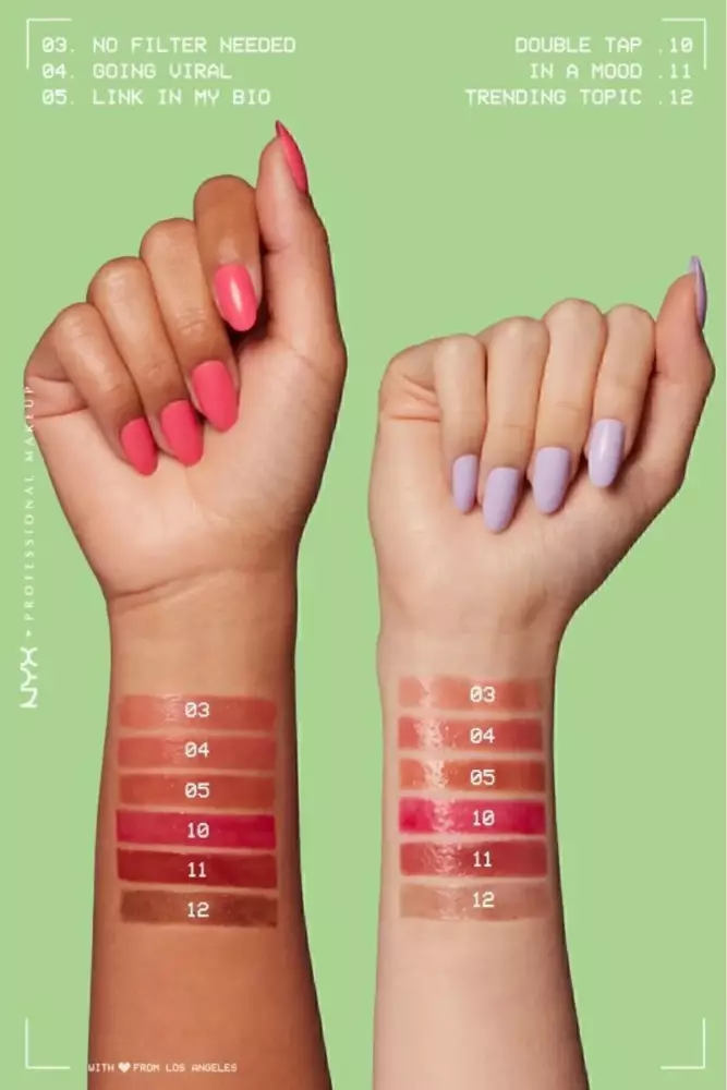 - *Renkler:* "Main Character" (şeffaf-parıltılı), "Going Viral" (berry tonu), "Link In My Bio" (nude pembe) gibi 12 seçenek.