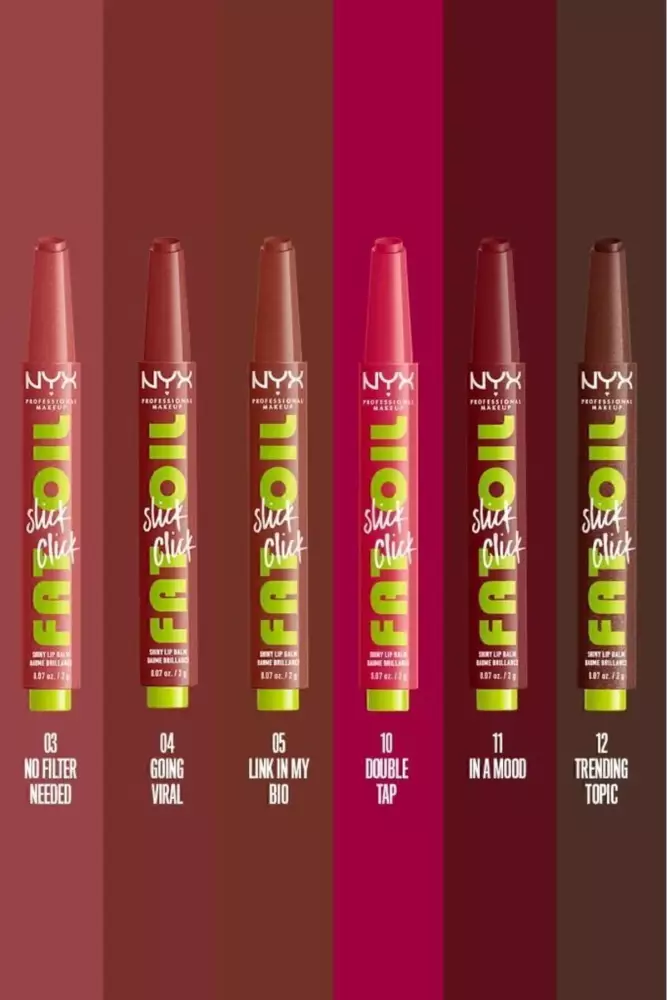 NYX Professional Makeup Fat Oil Slick Click, dudak balmı kategorisinde hem renk hem de bakım sunan yenilikçi bir üründür. Bu dudak balmı, tıklama mekanizmalı (click-up) ambalajıyla dikkat çeker ve tam Needed miktarda ürün çıkararak kolay ve pratik bir uygulama sağlar. Hafif, katmanlanabilir yapısıyla 12 saate kadar nemlendirme vaat eder. İçeriğinde avokado yağı, ahududu yağı ve yaban mersini yağı gibi vegan bileşenler bulunur; bu yağlar dudaklara yoğun bir bakım sunarken yapışkan olmayan, parlak bir bitiş bırakır. 12 farklı renk tonuyla sunulan bu balm, her cilt tonuna uygun seçenekler içerir ve günlük kullanıma ideal bir hafif pigmentasyon sağlar.